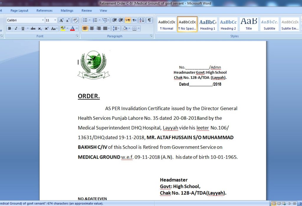school and college Medical Ground retirement order for govt and private employee in ms word documents .