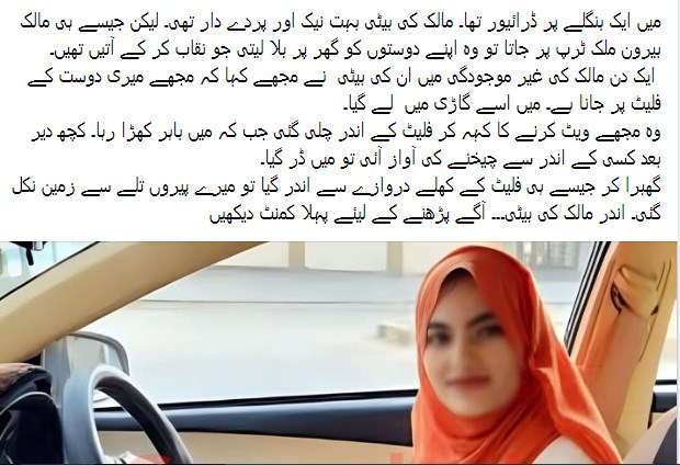 ایک دن، مالک کی غیر موجودگی میں، اس کی بیٹی نے مجھے اس کے دوست کے فلیٹ پر چھوڑنے کو کہا۔ میں نے اسے گاڑی میں بٹھایا اور اسے فلیٹ لے گیا۔