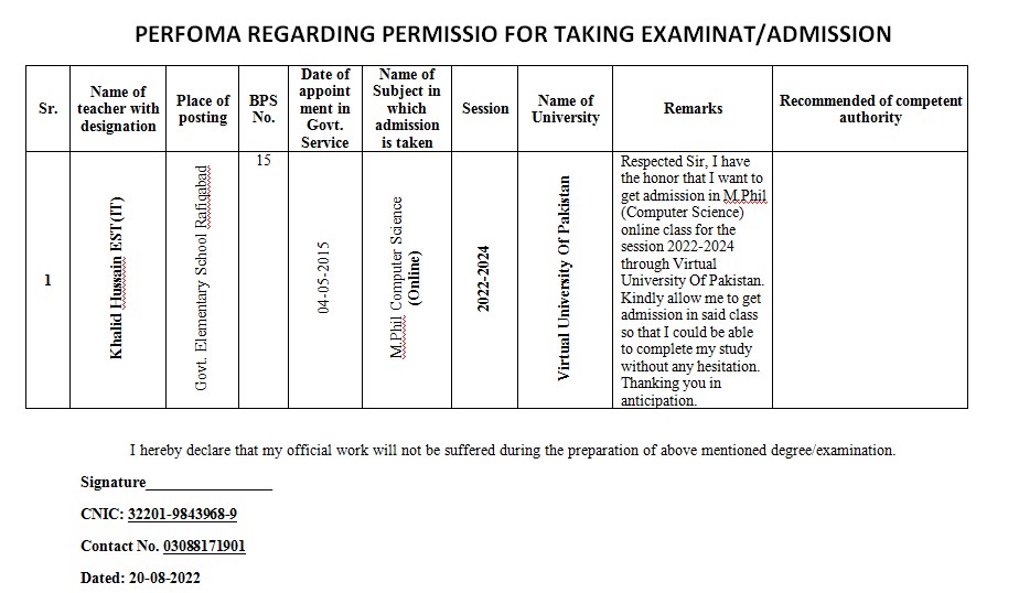 اجازت نامہ امتحان برائے گورنمنٹ ملازم