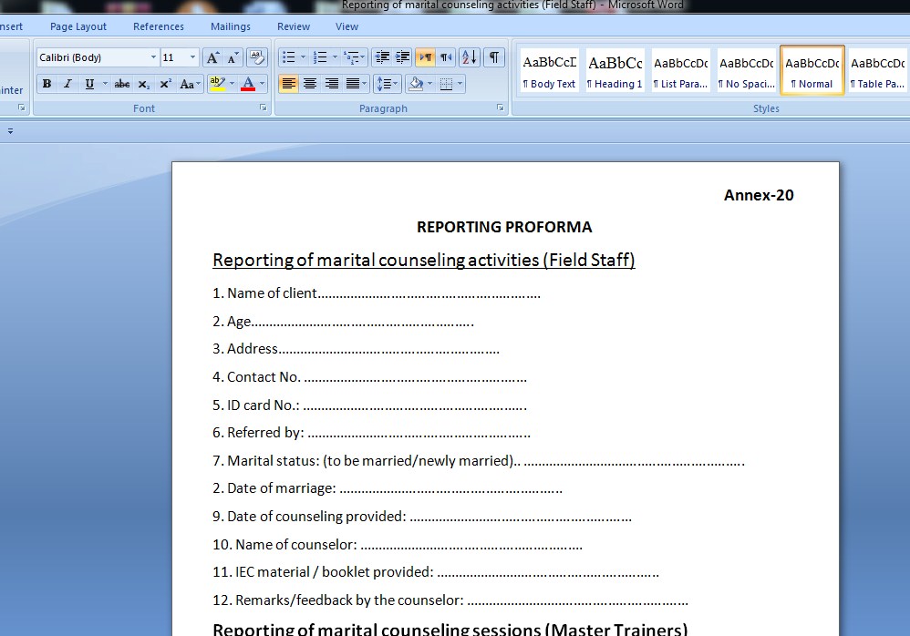 Downlaods Reporting of marital counseling activities (Field Staff) April 15, 2024 REPORTING PROFORMA Health Department Downloads soft copy of performa Reporting of marital counseling sessions (Master Trainers) Downlaod Link of health reporting form Reporting-of-marital-counseling-activities-Field-StaffDownload Reporting of activities may be supported with pictorial evidence Post Views: 849 Post Navigation Previous شہتوت ذیابیطس کے مریضوں کے لیے کیسا پھل ہےNext Original Link Hareem Shah Video Viral More Stories Education Downlaods Editor’s Picks Main Story Trending Story STI Teachers Jobs 2025 – School Wise vocancy List downlaod November 14, 2025 2 Downlaods Education معاہدہ برائے عارضی تقرری ٹیچر گورنمنٹ سکول October 5, 2025 Downlaods Education jobs and test Head Teachers Recruitment questions and ansowers July 15, 2025